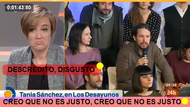 Así, la emoción mostrada es, esencialmente, negativa. Teniendo en cuenta la historia de la relación entre los dos personajes, Sánchez e Iglesias, el descrédito y el disgusto son el producto de la decepción. En este caso, el comportamiento de Tania Sánchez nos lleva a pensar que se ha sentido decepcionada por Pablo Iglesias, a la vez que algo abrumada por el comportamiento y los comentarios que éste realiza.